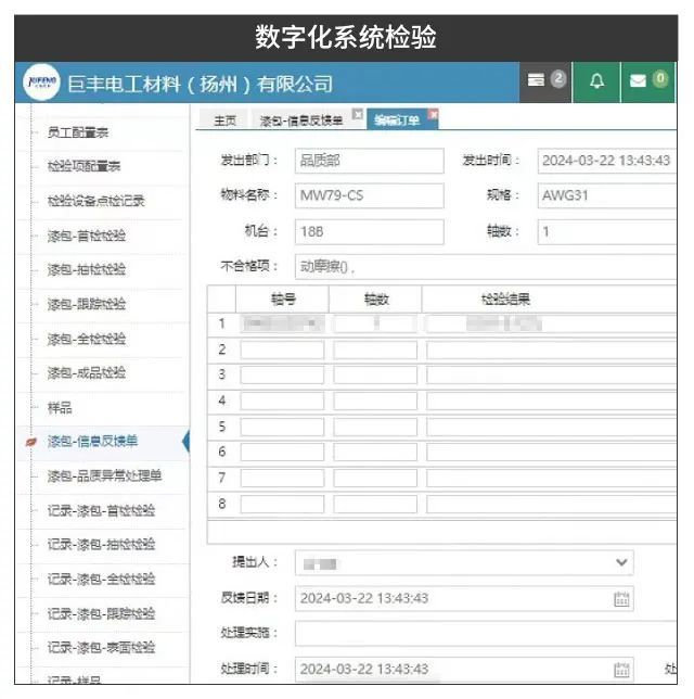 優(yōu)德普為巨豐建立起數(shù)字化標(biāo)準(zhǔn)質(zhì)量管控體系,掃碼同步數(shù)據(jù)自動(dòng)質(zhì)檢,系統(tǒng)對(duì)原材料檢驗(yàn)、銅桿檢驗(yàn)、抽檢等數(shù)據(jù)進(jìn)行記錄,質(zhì)檢管理具備異常處理流程,實(shí)現(xiàn)質(zhì)量信息的完整追溯,對(duì)不合格品進(jìn)行嚴(yán)格把控,并且能夠生成出廠報(bào)告與合格證。利用數(shù)字化手段,有效解決數(shù)據(jù)錄入錯(cuò)誤、分析結(jié)果可信度降低、大量的不良品等問題,并實(shí)現(xiàn)對(duì)質(zhì)量問題的追蹤、調(diào)查、排查和協(xié)調(diào)等工作。