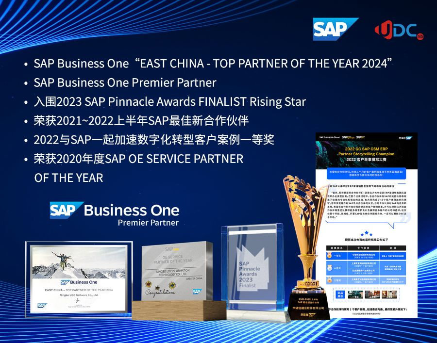 近日,優(yōu)德普旗下寧波優(yōu)德云軟件有限公司榮獲SAP Business One “EAST CHINA -TOP PARTNER OF THE YEAR 2024”獎項(xiàng)。SAP領(lǐng)導(dǎo)Head of SAP Business One - APAC Justin Ho,CSM of SAP Business One – GC 吳瑤一行專程蒞臨優(yōu)德云公司,授予UDC此項(xiàng)殊榮。