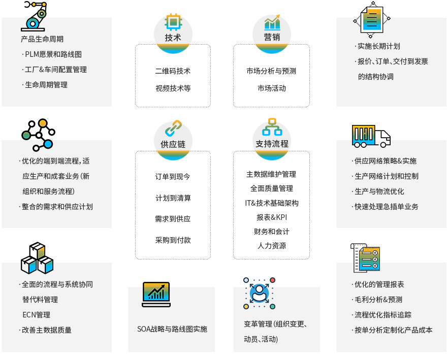 協(xié)助高科技企業(yè)信息化轉(zhuǎn)型升級(jí),通過ERP標(biāo)準(zhǔn)模塊與拓展模塊,實(shí)現(xiàn)精細(xì)化、數(shù)字化與智能化的管控,將線性供應(yīng)鏈轉(zhuǎn)變?yōu)橹悄芄?yīng)網(wǎng)絡(luò),形成整合與集成化的管理系統(tǒng),提高對(duì)市場(chǎng)的響應(yīng)速度。